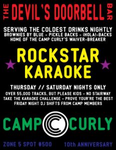 This year marks Camp Curly’s tenth year at Flipside and we are going all out this year with our biggest and best Rockstar Karaoke Party yet!